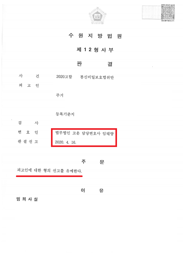 이에 재판부는 법무법인 고운의 주장을 모두 받아드려 의뢰인 A씨에게 선고유예의 형을 선고 하였습니다.