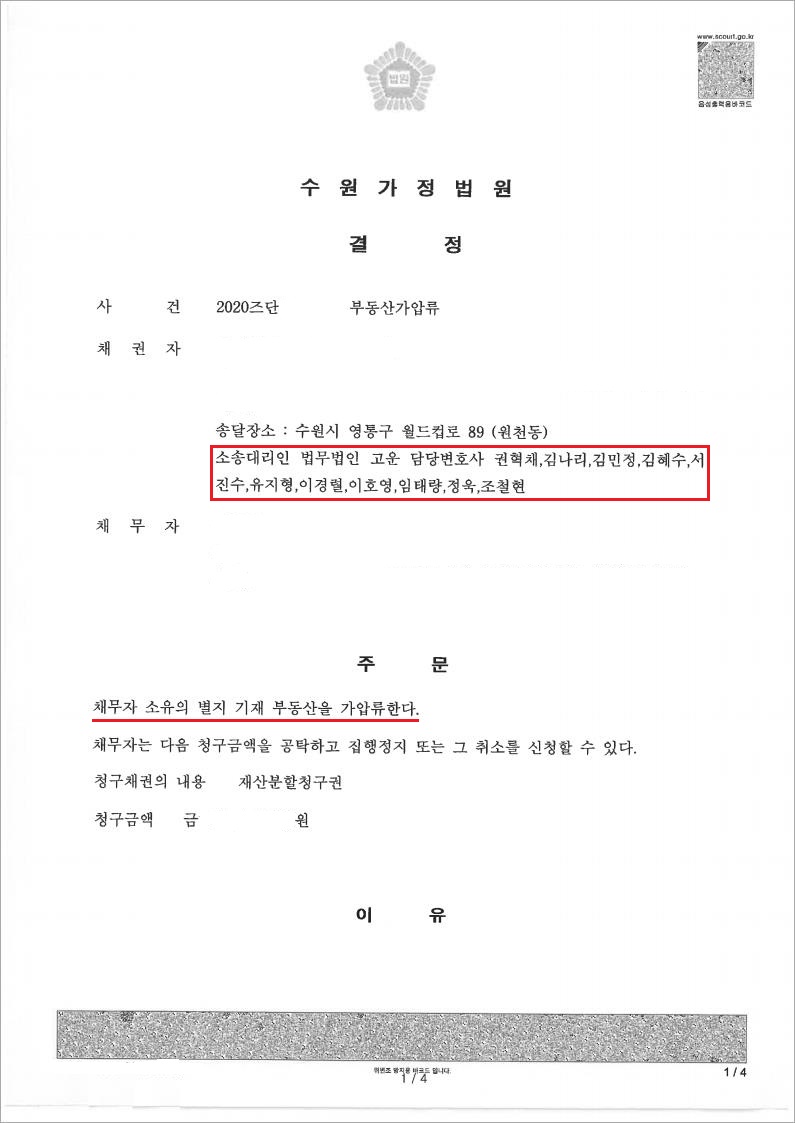 A씨와 B씨가 함께 거주하던 B씨 명의의 아파트는 A씨와 B씨의 유일한 재산이었고, B씨가 아파트를 매도하여 매매대금을 소비하거나 다른 사람 명의로 이전하여 버리면 이혼소송에서 A씨에게 재산분할청구권이 인정된다고 하더라도 강제집행에 어려움이 발생할 가능성이 높기 때문에 부동산가압류가 시급한 상황이었습니다. 이에 저희 법무법인 고운에서는 지체없이 부동산가압류 신청을 하여 신속하게 부동산가압류 결정을 받았고, 의뢰인 A씨는 재산분할청구권을 보전한 안정된 상태에서 이혼소송을 진행할 수 있게 되었습니다.