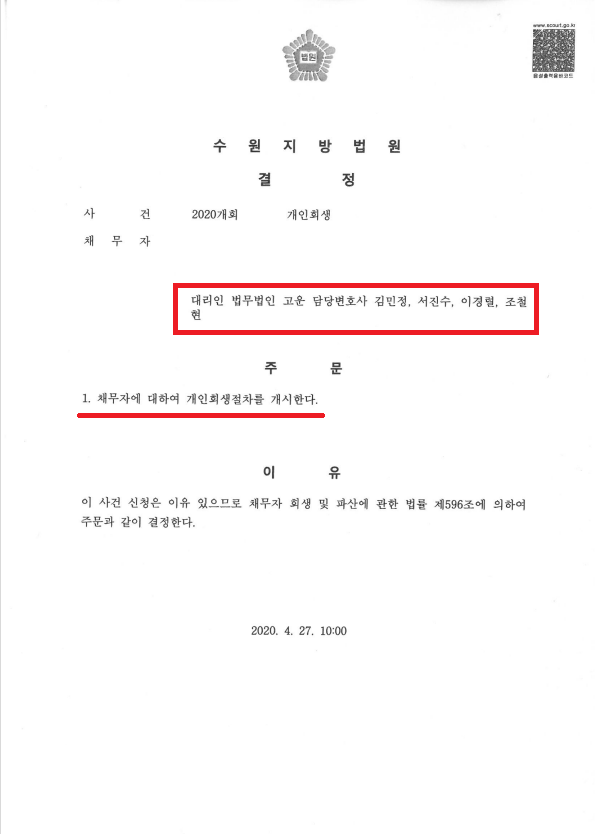 이에 저희 법무법인 고운은 의뢰인 A씨의 사건을 의뢰받아 잔존 원금의 70% 상당액을 36개월간 변제하는 것으로 개인회생 개시결정을 받았으며, A씨는 이로인해 채무를 원만히 조정하였고 1억 4천만원의 채무를 탕감 받는 것으로 종결되었습니다.