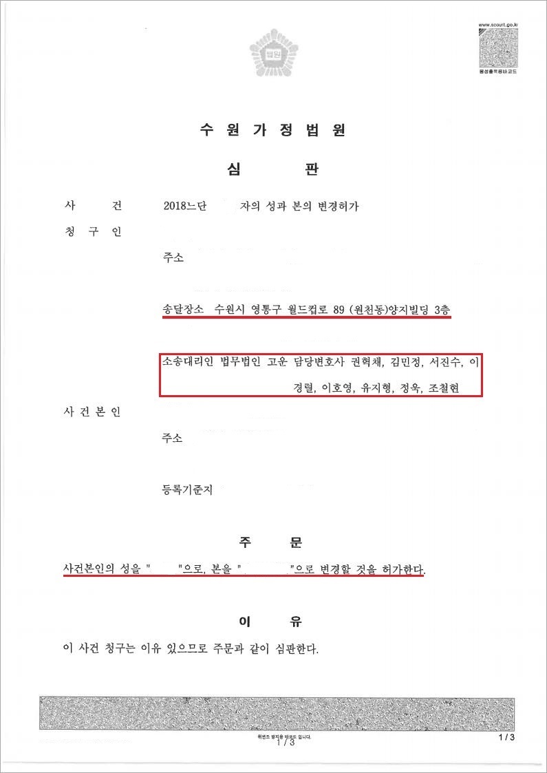 본 사건의 경우 A씨가 B씨와 협의이혼을 하면서 자녀의 친권자를 공동친권으로 정하였기 때문에 성본 변경에 앞서 친권자 변경이 필요한 상황이었고, 또한 전배우자 B씨가 A씨에 대하여 매우 적대적인 태도를 보여 B씨의 동의를 받는 것이 불가능한 상황이었습니다. 이에 저희 법무법인 고운은 자녀의 친권자 변경 절차를 먼저 진행하고, 자녀의 복리를 위하여 성과 본이 변경되어야 하는 필요성에 대하여 적극 소명하였고, 그 결과 친부 B씨의 동의 없이도 성본변경 결정을 받을 수 있었습니다.