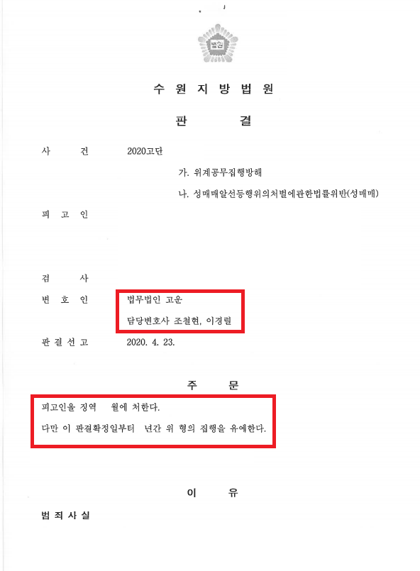 저희 법무법인 고운은 의뢰인 A씨가 그릇된 판단으로 허위고소를 하게 된 경위를 명확히 파악하여 재판부에 양형의 참작을 주장하였고, B씨의 인적사항만을 파악하기 위해 형사고소까지 이르게 된 점, 성매매라는 불법행위로 나아간 데는 B씨의 기망행위가 절대적 영향을 미쳤던 점, 또한 의뢰인 A씨가 행동교정을 도울 사회적인 유대관계가 분명한 점을 적극적으로 재판부에 주장하였습니다.
