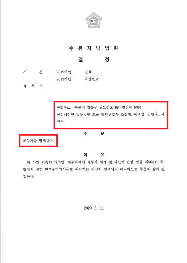 이에 저희 법무법인 고운은 의뢰인 A씨의 사건을 의뢰받아 면책불허가 사유가 존재하는지, 비면책채권의 여부 등 면밀히 사건을 파악하여 법원의 개인파산을 결정, 이후 파산절차 폐지와 모든 채무를 탕감 받는 면책결정까지 받았습니다.