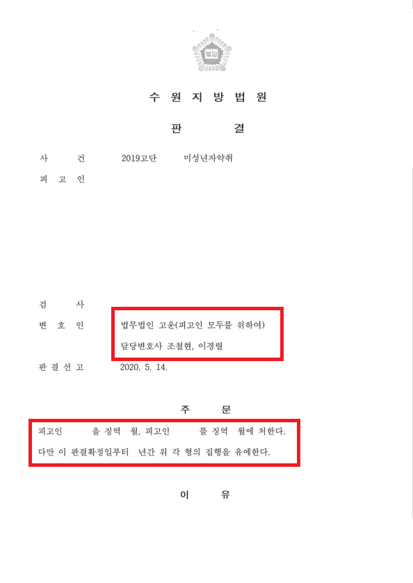 이에 검찰은 중한 실형을 구형하였으나, 재판부에서 저희 법무법인 고운의 주장을 상당부분 인용하여 집행유예의 선고를 하였습니다.