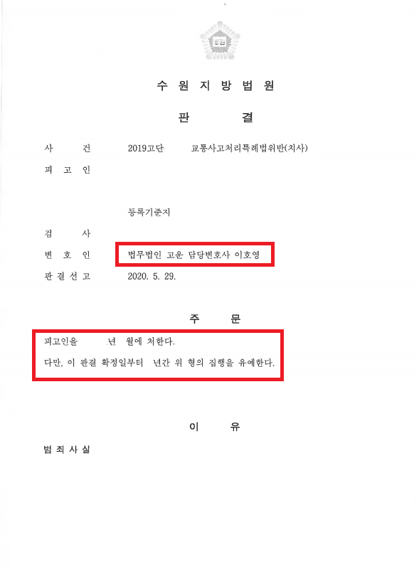 재판부는 저희 법무법인 고운이 주장한 양형의 참작에 대하여 상당부분 인용하여 의뢰인 A씨에게 집행유예의 판결을 선고하였습니다.