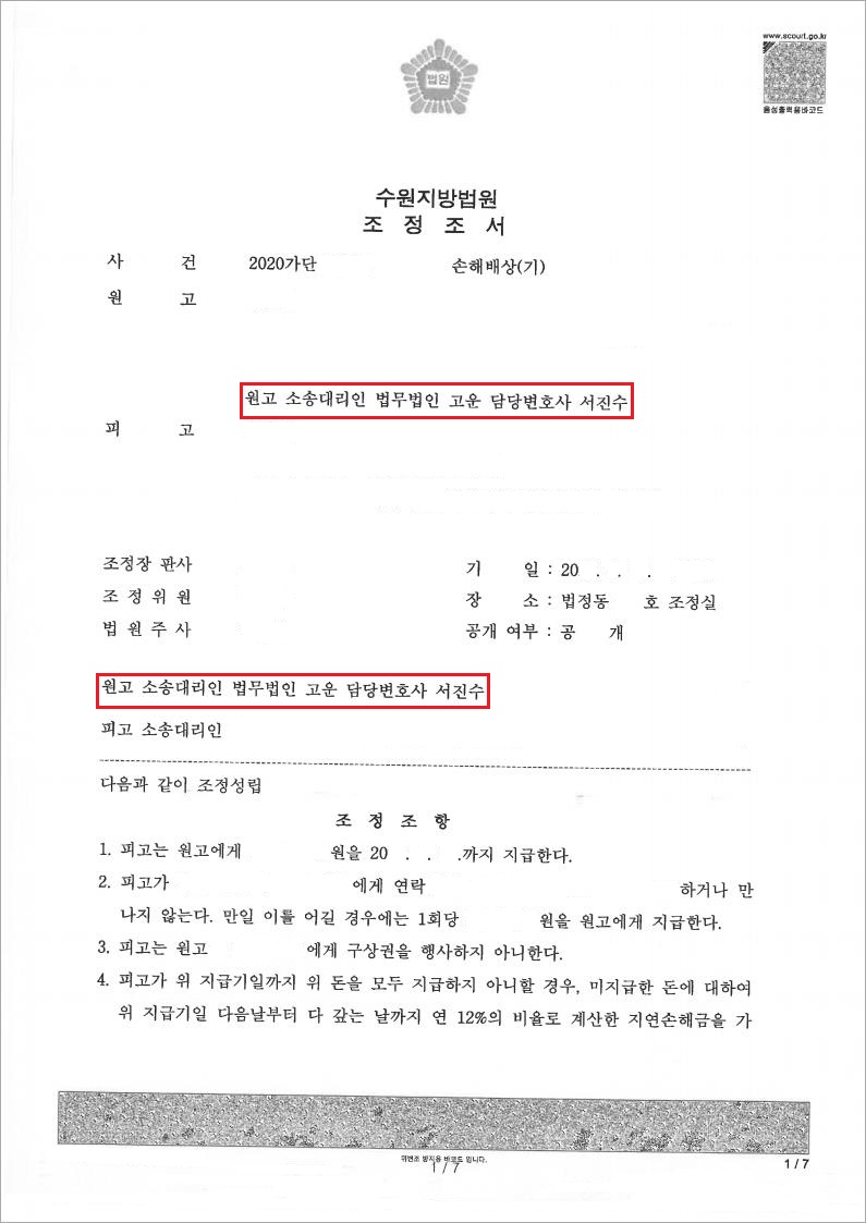 그 결과 의뢰인 A씨는 조정절차를 통하여 C씨로부터 상당한 위자료를 지급받게 되었고, 나아가 저희 고운은 A씨가 바라던 대로 C씨로부터 다시는 B씨와 만나지 않겠다는 약속을 받고 이를 어길 시 추가적인 손해배상을 받기로 하는 내용으로 원만히 조정을 성립시켰습니다.