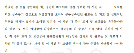 법원은 법무법인 고운의 주장을 대부분 받아들여, 공동상속인들 간의 실질적인 형평을 고려하였을 때 의뢰인이 아버지로부터 증여받은 부동산 전체를 특별수익에서 제외하였고, 의뢰인이 아버지로부터 현금을 증여받았다는 등의 나머지 원고들 청구 또한 배척하였습니다.