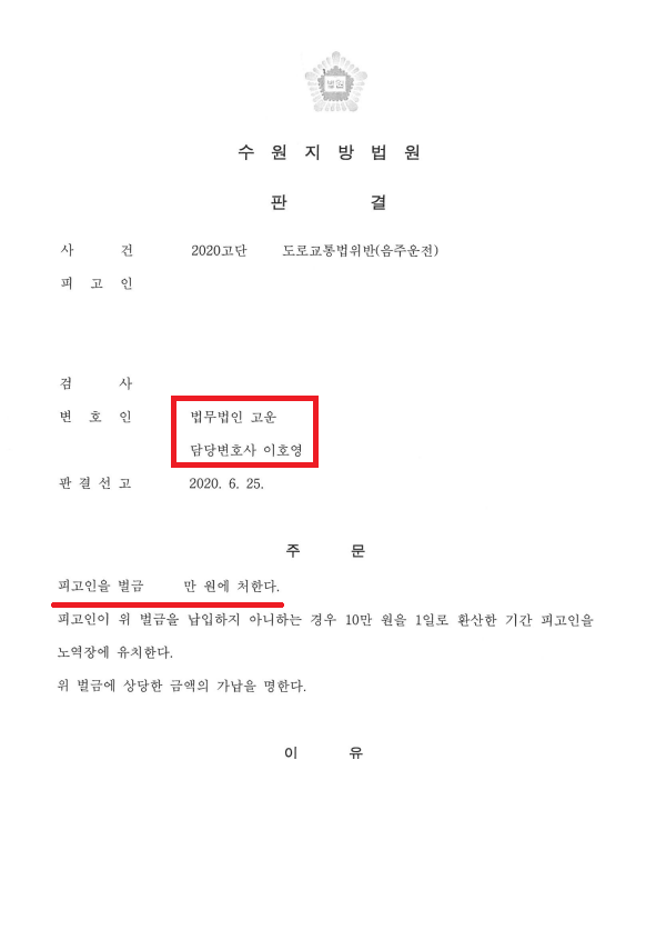 저희 법무법인 고운은 이 사건 음주운전으로 인한 추가피해가 발생하지 않은 점, 기소유예 전과 외 아무런 전과가 없는 점, 사건 당일에 대리운전을 할 수 없게된 경위 등 의뢰인의 유리한 정상을 재판부에 적극적으로 선처 취지의 의견을 주장하였습니다.
