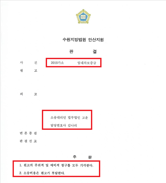 재판부는 저희 법무법인 고운의 주장을 모두 받아들여 B씨의 청구를 모두 기각하고, 소송비용 또한 B씨가 부담하는 내용의 판결을 선고하였습니다. 소송에 모두 이기고 소송비용까지 받게 된 의뢰인은 아주 만족하셨습니다.