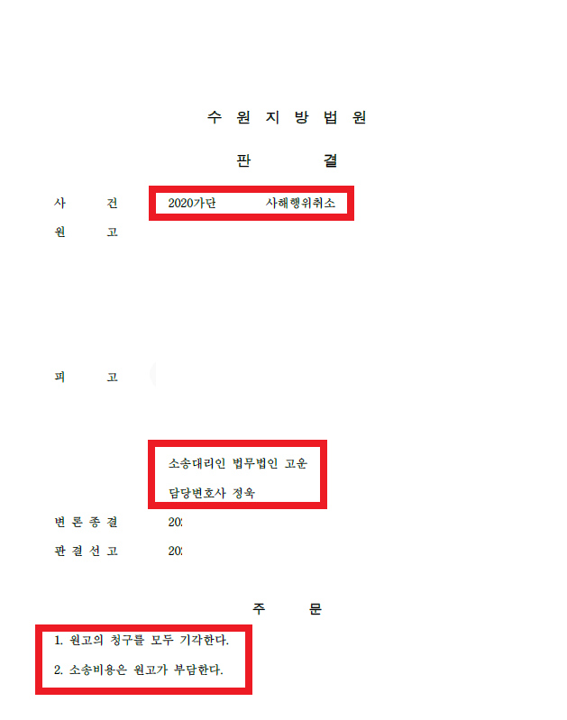 재판부는 저희 법무법인 고운의 주장을 모두 받아들여 D씨의 청구를 모두 기각하고, 소송비용 역시 모두 D씨가 부담하는 내용의 판결을 선고하였습니다. 의뢰인 A씨는 소송에서 승리하고 소송비용까지 받게 되어 아주 만족하셨습니다.