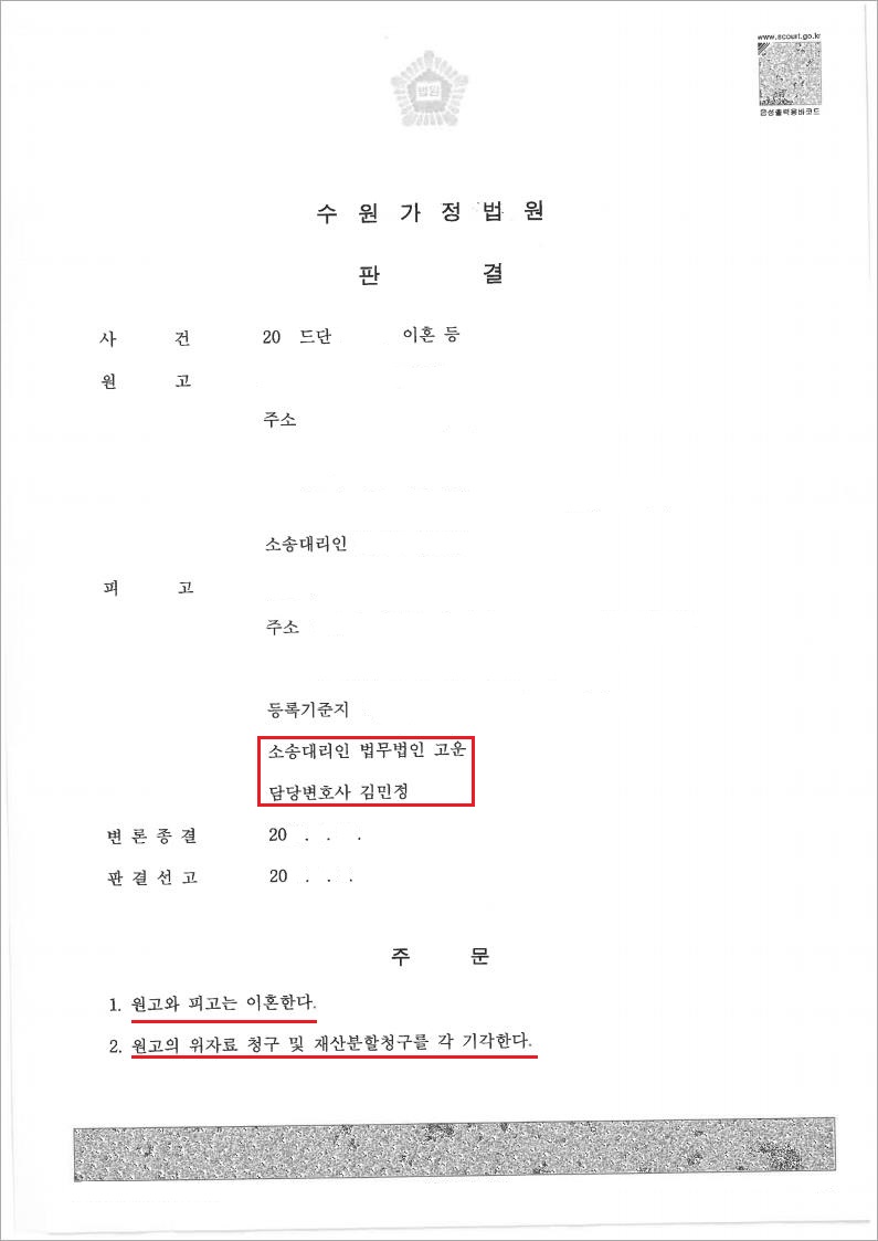 의뢰인 A씨는 배우자 B씨로부터 이혼과 함께 위자료·재산분할 청구를 받자 고운에 의뢰했습니다. B씨의 귀책 주장을 반박하고 혼인 파탄의 원인이 B씨에게 있음을 입증 하였고, 그 결과 법원은 B씨의 위자료 및 재산분할 청구를 모두 기각했습니다.