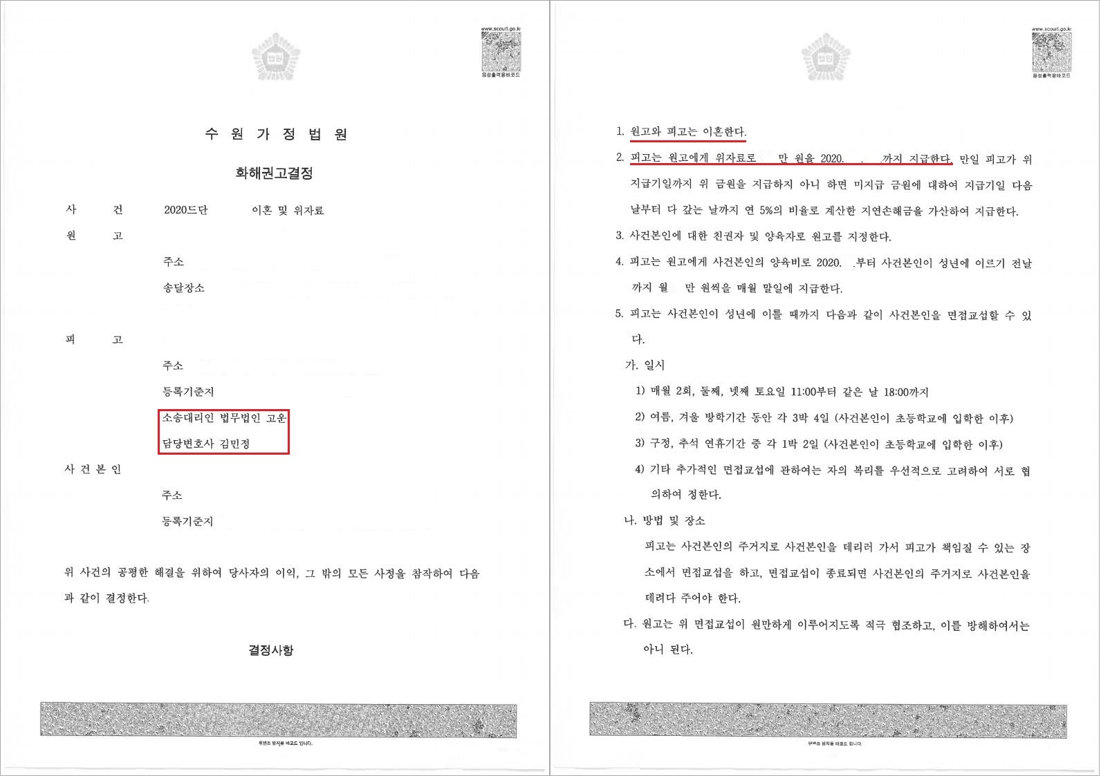 그 결과 의뢰인 A씨가 별거 과정에서 형사처벌을 받는 등 다소 불리한 정황이 있었음에도 불구하고, 결국 B씨가 청구한 위자료 금액의 80% 이상, 양육비 청구 금액에 대하여 50% 이상을 감액하는 유리한 내용의 화해권고결정을 받게 되었습니다.