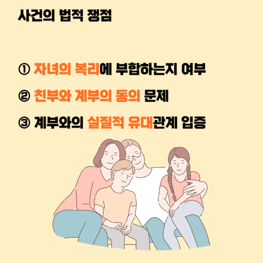 본 사건은 미성년 자녀 A양이 친모 B씨, 계부 C씨와 함께 새로운 가정을 이루며 안정적으로 성장하는 과정에서 발생했습니다. A양은 친부모의 이혼 이후 친모 B씨와 생활하였고, 친부는 이혼 이후 단 한 차례도 A양을 만나지 않았습니다.
