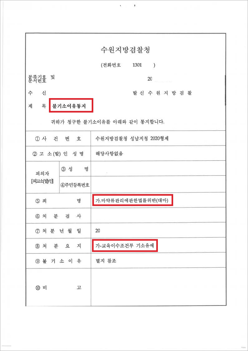 검찰은 법무법인 고운의 주장을 받아들여 의뢰인에게 기소유예 처분을 내렸습니다. 의뢰인은 어린 나이에 마약관련 전과사실이 생길 뻔했었는데, 잘 마무리가 되어 매우 만족하였습니다.
