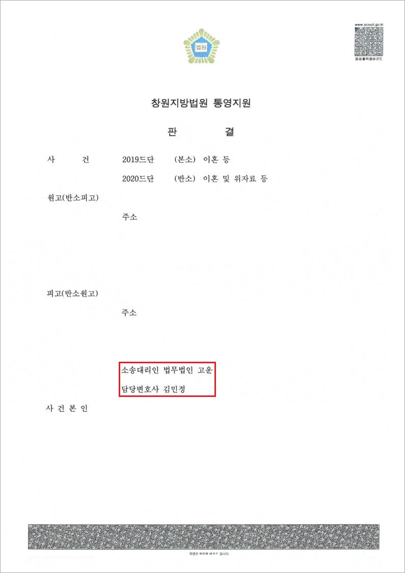 결국 이혼 및 위자료 청구 등 B씨의 청구는 대부분 기각되었고, 의뢰인 A씨의 반소가 받아들여져 이혼 및 위자료, 자녀들에 대한 친권자 및 양육자 지정에 승소하였고, 또한 B씨의 재산분할 청구 중 50% 이상을 감액하는 것으로 의뢰인 A씨가 바라던 내용의 판결을 받게 되었습니다.