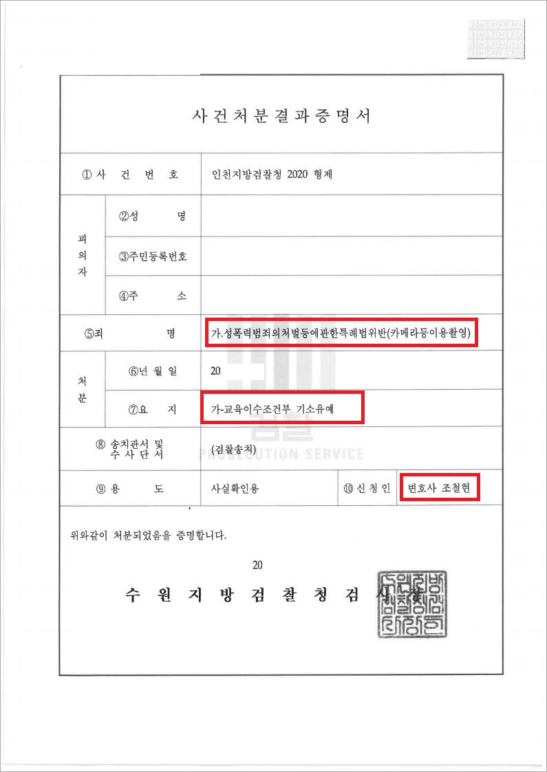 검찰은 법무법인 고운의 주장을 받아들여 의뢰인에게 기소유예 처분을 내렸습니다. 의뢰인은 한순간에 성범죄 전과자가 될 상황에서 기소유예 처분을 받았다는 사실에 매우 만족하였습니다.