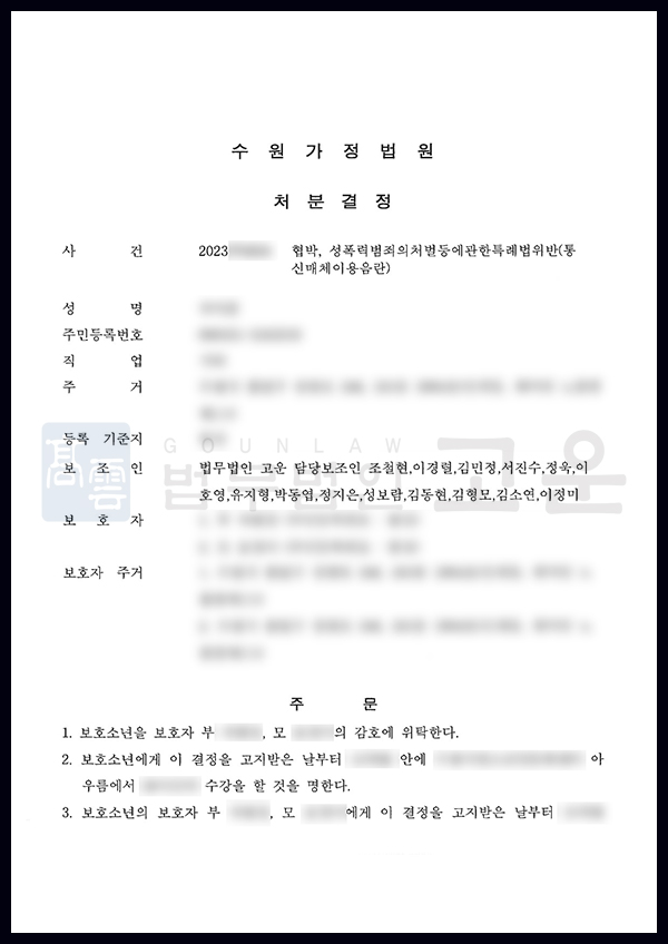 그 결과 아청법 위반 혐의에 대해서는 혐의없음 처분을, 통매음과 협박 혐의에 대해서는 1호 감호위탁, 2호 수강명령이라는 가벼운 처분만을 받을 수 있었습니다.