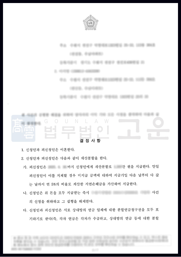 A씨는 처음에는 이혼을 원치 않았으나, 조정신청서의 내용을 검토한 후에는 이혼에는 동의하되, 과도한 위자료와 재산분할 요구만큼은 반드시 방어하고 싶다는 의사로 법무법인 고운을 찾으셨습니다.