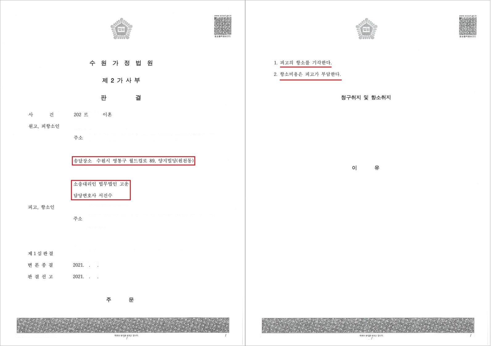 상대방 B씨는 원심 판결에 불복하여 A씨의 청구가 기각되어야 한다고 주장하였고, 이에 저희 법무법인 고운은 B씨의 주장이 타당하지 않으며 원심대로 A씨의 청구가 인용되어야 한다는 점에 대하여 적극 주장하였고, 결국 의뢰인 A씨가 바라던 대로 항소기각판결을 받게 되었습니다.
