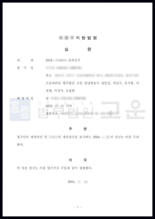 A씨는 고인의 사망 후 3개월이 다 되어가는 시점에 찾아오셔서 상속포기 진행 시간이 부족할 수 있었으나, 법무법인 고운의 신속한 대응으로 상속포기 청구가 수리되었습니다. B씨가 남긴 채무 변제 의무에서 벗어나게 된 A씨는 법무법인 고운의 빠르고 정확한 진행 과정에 크게 만족하였습니다.
