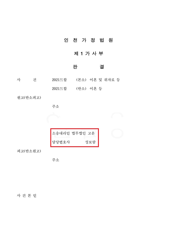 그 결과 법원은 B씨의 이혼 청구를 기각하고 의뢰인 A씨의 이혼 청구를 인용하여 A씨는 상당한 금액의 위자료와 재산분할금을 받게 되었고, 소송기간 중 지급받지 못했던 과거양육비까지 모두 지급받게 되었습니다.