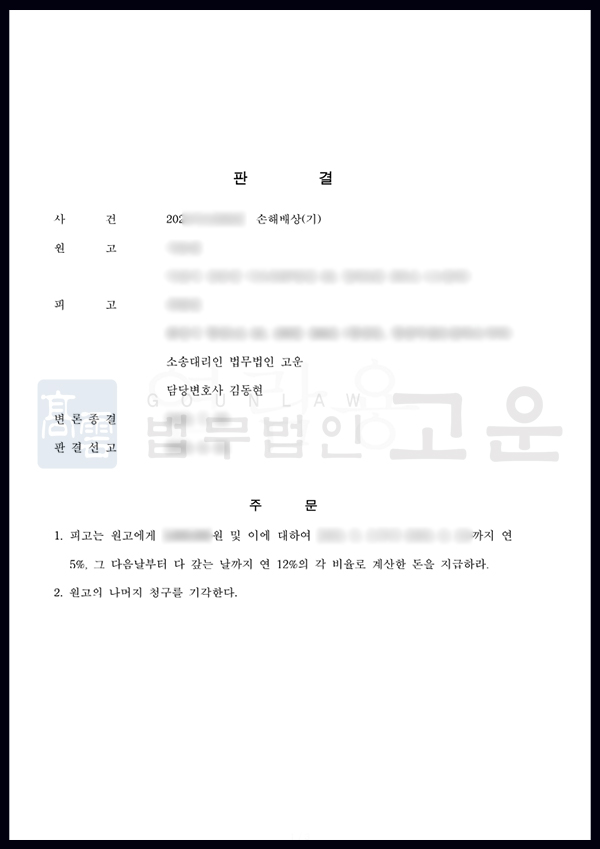 재판부는 법무법인 고운의 주장을 상당 부분 받아들였고, B가 청구한 위자료 중 90% 에 해당하는 부분에 대해 기각 결정을 하였습니다. A는 자신이 상사로서 한 행위로 억울하게 거액의 위자료를 지불할 뻔 하였으나, 고운의 조력으로 큰 피해를 막았다는 사실에 매우 만족하였습니다.