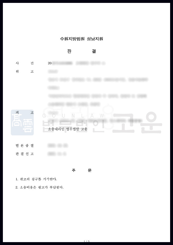 재판부는 법무법인 고운의 주장을 전부 받아들였고, B사의 청구를 모두 기각하는 판결을 내렸습니다. 이로 인해 의뢰인은 B사에 돈을 한 푼도 지급하지 않음은 물론, 오히려 B사로부터 변호사비용 전부를 지급받을 수 있게 되어 큰 만족을 하셨습니다.