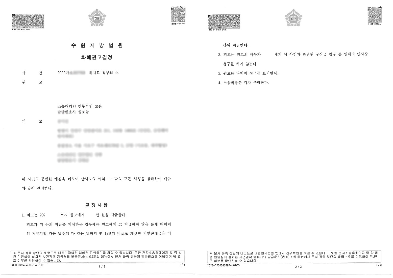 재판부는 B의 주장을 배척하고 법무법인 고운의 주장을 받아들여 위자료 청구를 인용하는 것으로 화해권고 결정을 내렸습니다.