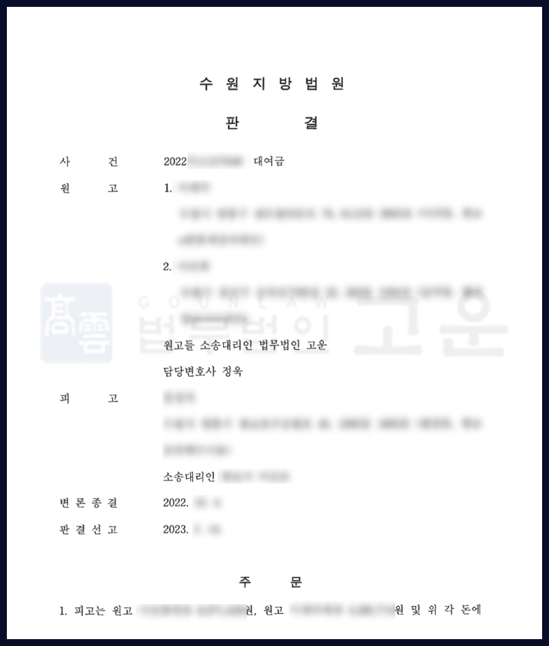 결국 재판부는 법무법인 고운의 주장을 받아들여, 피고 C씨에게 의뢰인들에 대한 차용금을 반환하고 재판비용 역시 C씨가 부담하라는 판결을 내렸습니다.