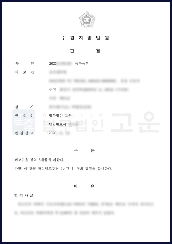 A는 채무 문제로 지인 B에게 협박을 받던 중 벗어나기 위해 칼을 들었다가 특수폭행 혐의로 체포되어 법무법인 고운에 의뢰했습니다. 고운은 A가 가해 의도가 아닌 방어 목적이었고 깊이 반성하고 있음을 강조했으며, 법원은 이를 받아들여 실형 대신 집행유예를 선고했습니다.