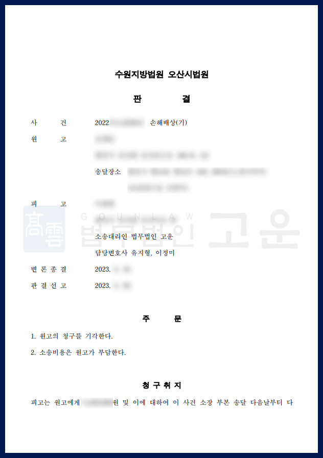 결국 재판부는 법무법인 고운의 주장을 그대로 받아들여, 의뢰인 A가 상대방 B와 체결한 약정을 이행하지 않았더라도, 의뢰인 A의 약정 불이행으로 인하여 상대방 B의 손해가 발생하였다고 볼 수 없다는 이유로 상대방 원고 B의 청구를 전부 기각하였고, 이에 의뢰인 A는 소송 결과에 매우 만족하셨습니다.