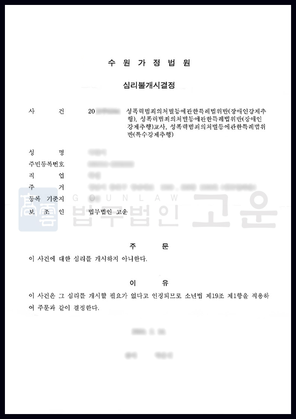 법무법인 고운의 조력으로 소년재판부는 A에게 심리불개시 결정을 내렸습니다. 이는 A에 대한 소년재판을 진행하지 않고 소년부 판사가 훈계하는 정도에서 사건을 마무리짓고 다른 어떠한 보호처분도 받지 않게 되었다는 의미입니다. 재판단계가 길게 지속되지 않고, A가 어떠한 처분도 받지 않아 마음의 짐을 덜게 된 것에 의미가 있는 사건이었습니다.