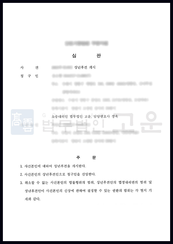 하지만 법무법인 고운은 B의 상태에 대해 전문가의 감정서 등 객관적인 증거자료를 다수 확보하여 성년후견인 지정이 필요함을 강하게 주장하였고, 다른 가족의 동의서와 진술서도 받아 제출하는 등 B가 성년임에도 보호가 절실히 필요한 상태라는 점을 강조하여 의미 있는 결과를 이끌어낼 수 있었습니다.