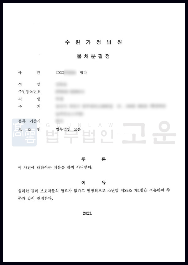 그 결과 법원으로부터 불처분 결정을 받을 수 있었습니다. 일반 성인의 불처분이란 수사단계에서 사건이 종결되는 것을 말하지만, 소년부 불처분의 경우 재판단계까지 진행되었음에도 변호인의 의견을 받아들여 판사가 보호소년에게 처분을 내리지 않겠다고 판결한 것을 의미합니다. 즉 일반 형사사건의 ‘무죄판결’과 의미가 같으며, A는 고운변호사의 조력으로 무죄판결과 같은 불처분 결정을 받을 수 있었습니다. 좋은 결과에 대해 A와 부모님은 매우 만족하였습니다.