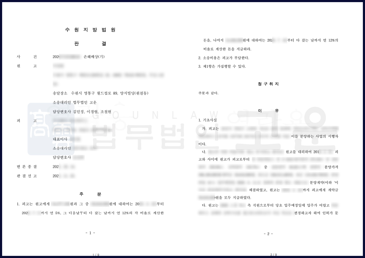 A는 법무법인 고운의 도움으로 계약금 반환은 물론 손해배상금과 소송비용까지 모두 받을 수 있게 되어 매우 만족하였습니다.