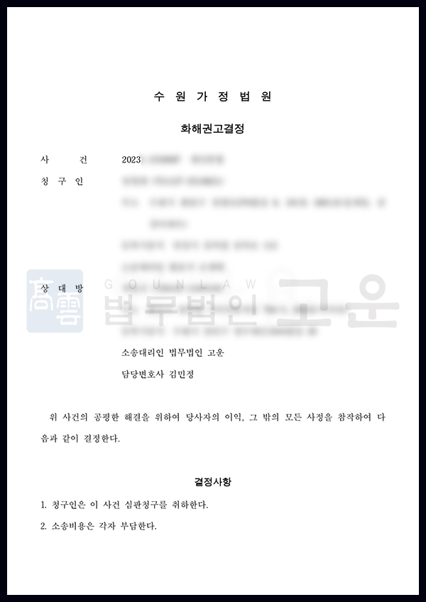 그 결과 화해권고결정을 통해 B씨가 재산분할 청구를 포기하였고약 4개월 만에 조속히 소송이 마무리되었습니다의뢰인 A씨는 결과에 매우 만족하셨습니다.